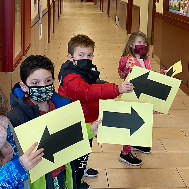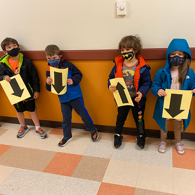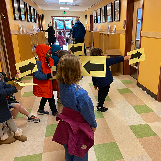 In small groups, they embarked on a directional field trip around Rashi with their arrows and used specific language to describe their location. For example, the nurses office is NEXT to the library. The Art Room is ABOVE the Grade 1/2 hallway. The K classroom is BELOW the music room.