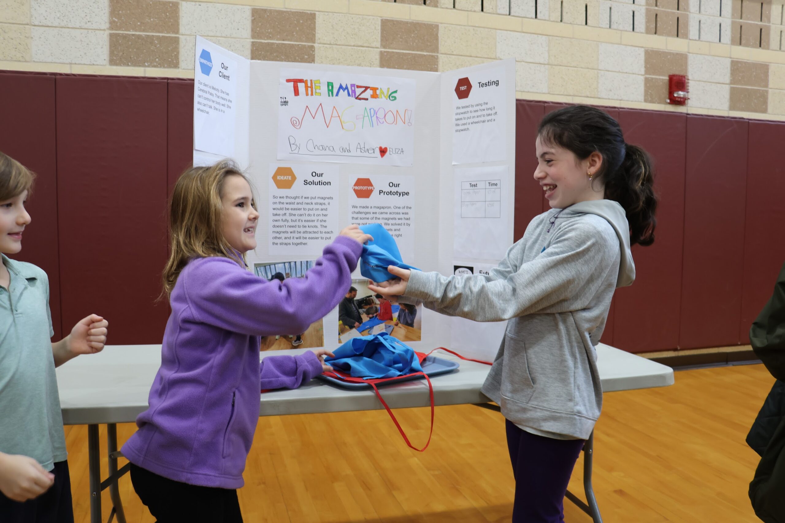In addition, Rashi third graders recently completed a science unit on magnetism. This gave them the tools to begin thinking about real-world applications for magnets. Beginning with empathy, students put themselves in the minds & bodies of their differently abled clients who face daily challenges when getting dressed. In teams of three, they thoughtfully designed and built prototypes of adaptive shirts, shoes, cleats, swimsuits, aprons and pants.